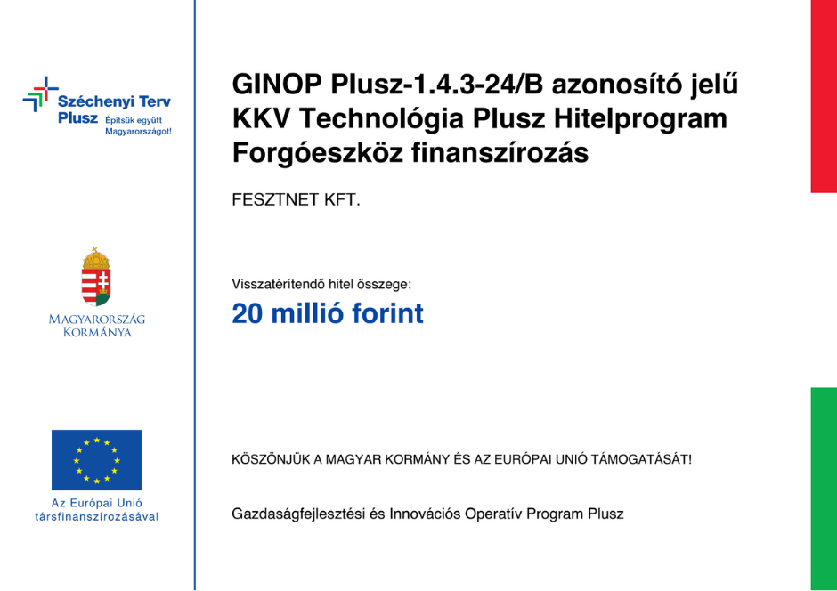 GINOP Plusz – 1.4.3 -24/B azonosító jelű KKV Technológia Plusz Hitelprogram – Forgóeszköz finanszírozás keretén belül a FESZTNET Kft. 20 000 000 forint visszatérítendő támogatást kapott Magyarország Kormánya és az Európai Unió jóvoltából.
